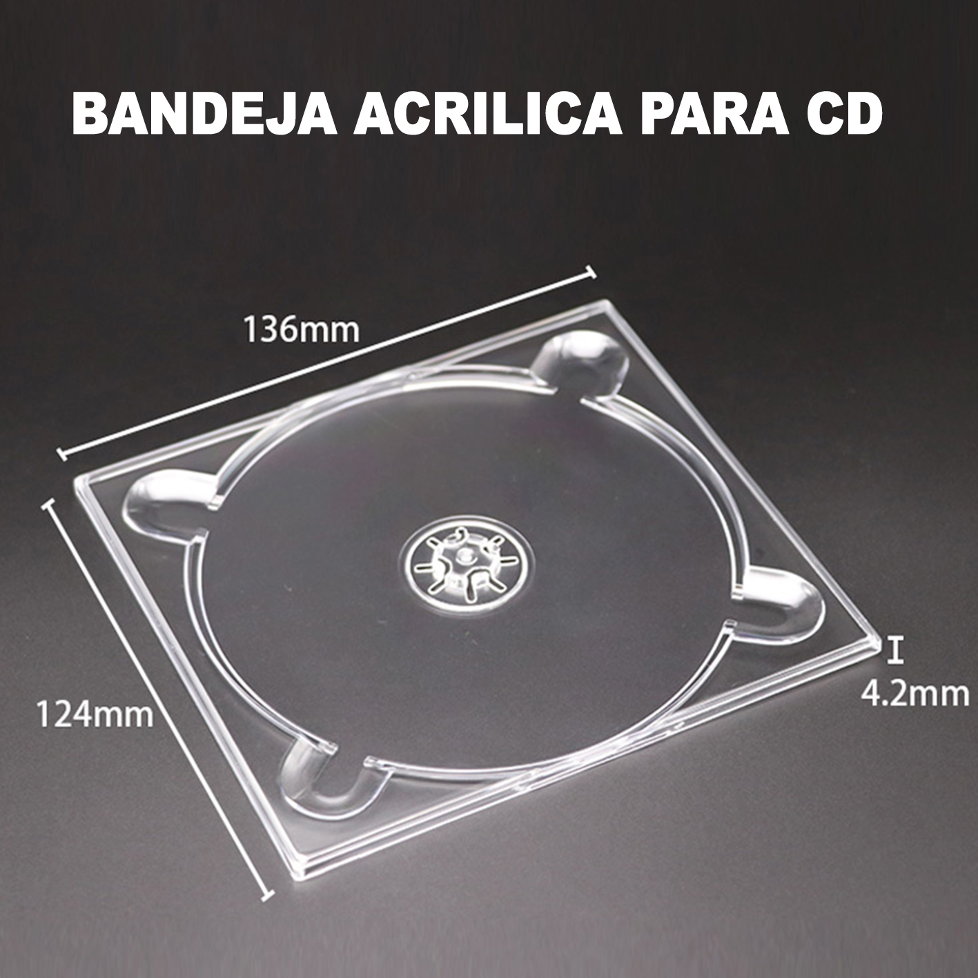 Bandeja delgada de acrílico transparente para CD, ideal para almacenar o presentar discos de forma segura y profesional. Gracias a su diseño liviano y resistente, es perfecta para duplicación, distribución o venta de discos. Disponible con envío a domicilio en todo el país.